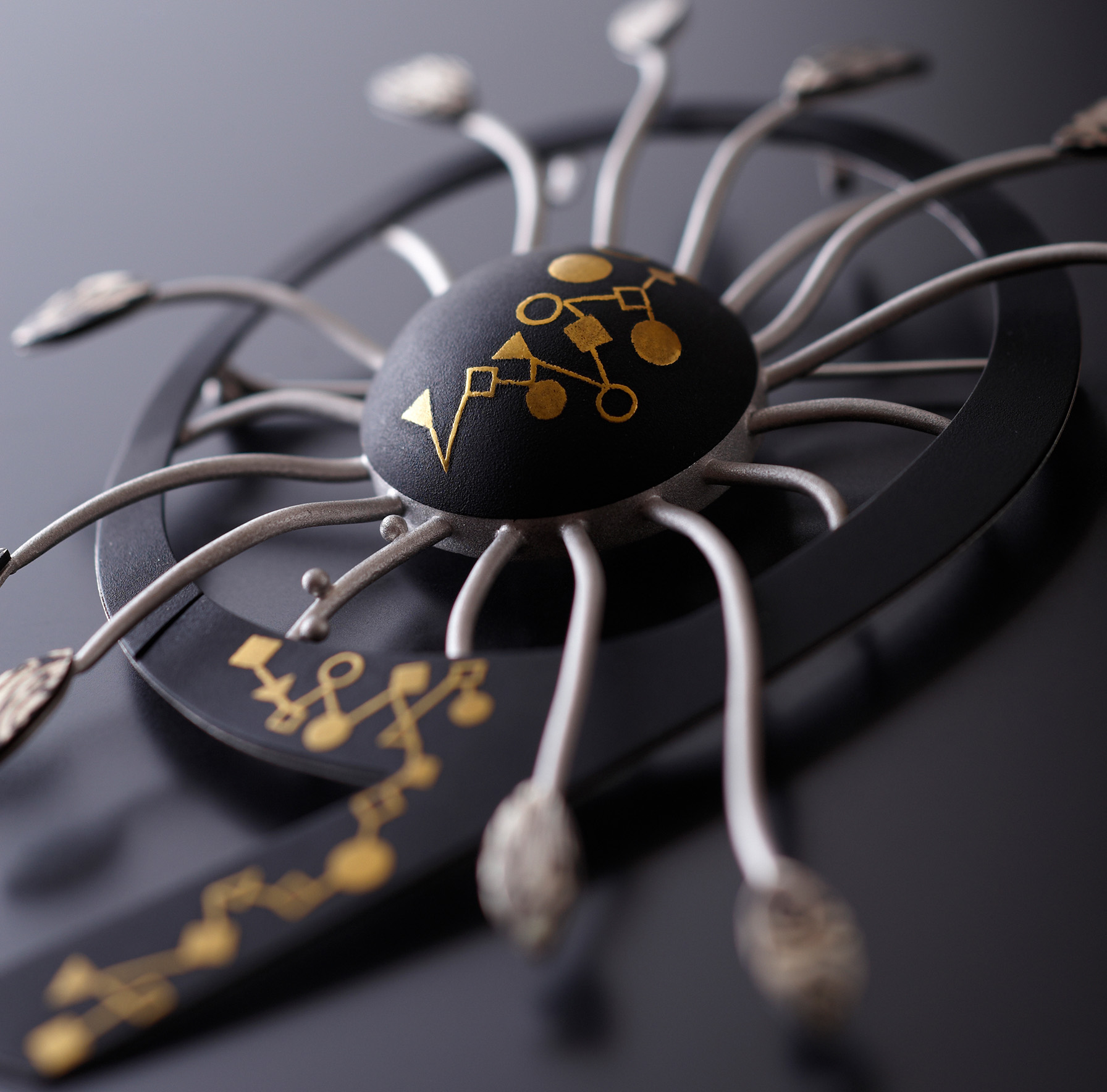 工芸家紹介のTOPに戻る ジャンル 肥ひ後ご象ぞうがん 雅号・地域 (熊本市) 氏名 津つ崎ざき洋よう子こ プロフィール 工芸品紹介 インタビュー 作品紹介 工芸家プロフィール 1937年 生誕。 肥後象がんの伝統美に魅せられ、この道へ。 伝統技法に女性的な感性を取り入れた独創的な作品は、西部工芸展朝日新聞社賞や日本伝統工芸士会作品展などを受賞多数。 2004年 肥後象がんで伝統工芸士に認定される。 その他 伝統工芸士 ページTOPへ/HOME 肥(ひ)後(ご)象(ぞう)がんについて 肥(ひ)後(ご)象(ぞう)がんは熊本県(くまもとけん)に4つある国指定(くにしてい)の伝統的工芸品(でんとうてきこうげいひん)のひとつです。 肥(ひ)後(ご)象(ぞう)がんは鉄(てつ)に「金(きん)」や「銀(ぎん)」をはめこんで様々な模(も)様(よう)を表(ひょう)現(げん)します。「刀(かたな)のつば」や「火(ひ)縄(なわ)銃(じゅう)」の金(かな)具(ぐ)の装(そう)飾(しょく)がはじまりといわれています。 工芸品紹介ページ:肥(ひ)後(ご)象(ぞう)がん ページTOPへ/HOME 記事を選択するとインタビューが表示されます。 インタビュー(2010年頃) ▼ なめらかなカーブを描く鉄にダイヤモンドを組み合わせたブローチや、ドクロをモチーフにしたリングなど、津崎洋子さんが生み出す肥後象がんはジュエリーアートと呼ぶにふさわしいです。鉄や銀を重ね合わせて木目模様を出す木目金をはじめ、縄目象嵌や高たか肉にく象嵌など、さまざまな技法を使うことで今までにない独創的なデザインを表現してきました。 そもそも津崎さんが肥後象がん師を目指したのは、ある美術館に展示された刀の鐔つばとの出会いが人生の転機となりました。「もともと、地元である熊本の工芸に携わりたいという思いはありました。鐔を見たとき、黒い鉄地と金銀で施された見事な細工のコントラストが美しくて感動したんです。この伝統美を自分なりに表現してみたいと思い、この道へ進む決心をしました」やると決めたら即、実行。東京へ移り住んで日本宝飾クラフト学院で宝飾全般、他、各教室で伝統工芸、鍛金、ワックス等を学び、さらに創作の幅を広げたいとアートジュエリーの技術も身につけました。 「自分でやると決めたからには最後まで成し遂げたい。なによりも好きだからやってこられました」と微笑む津崎さん。人並み以上の努力を重ねた結果、彼女にしか表現出来ない新しい肥後象がんの世界を開拓しました。その卓越したデザイン性と技術は高く評価され、日本橋の有名デパートで個展を行うまでに。 津崎さんの場合、最初にデザイン画を起こして創作へと進みますが「とくに何かからヒントを得ることはなく、天から降ってくるように次々とアイデアが浮かんでくるんですよ」とは、うらやましい限りです。 刀の鐔つばやブローチに施されるデザインは、そのどれもが女性らしい繊細さに満ちている。「400年以上もの歴史を持つ肥後象がんですが、アートジュエリーとして身につけることで、少しでも多くの方にこの伝統工芸を知っていただければ嬉しいですね」。 ページTOPへ/HOME ブローチ宇宙(木目金) 津つ崎ざき洋よう子こ 宇宙をテーマにしたブローチは、チェーンを付けるとネックレスに変身。高度なテクニックを要する木目金などの彫金技法が取り入れられている。 ページTOPへ/HOME 工芸家紹介のTOPに戻る