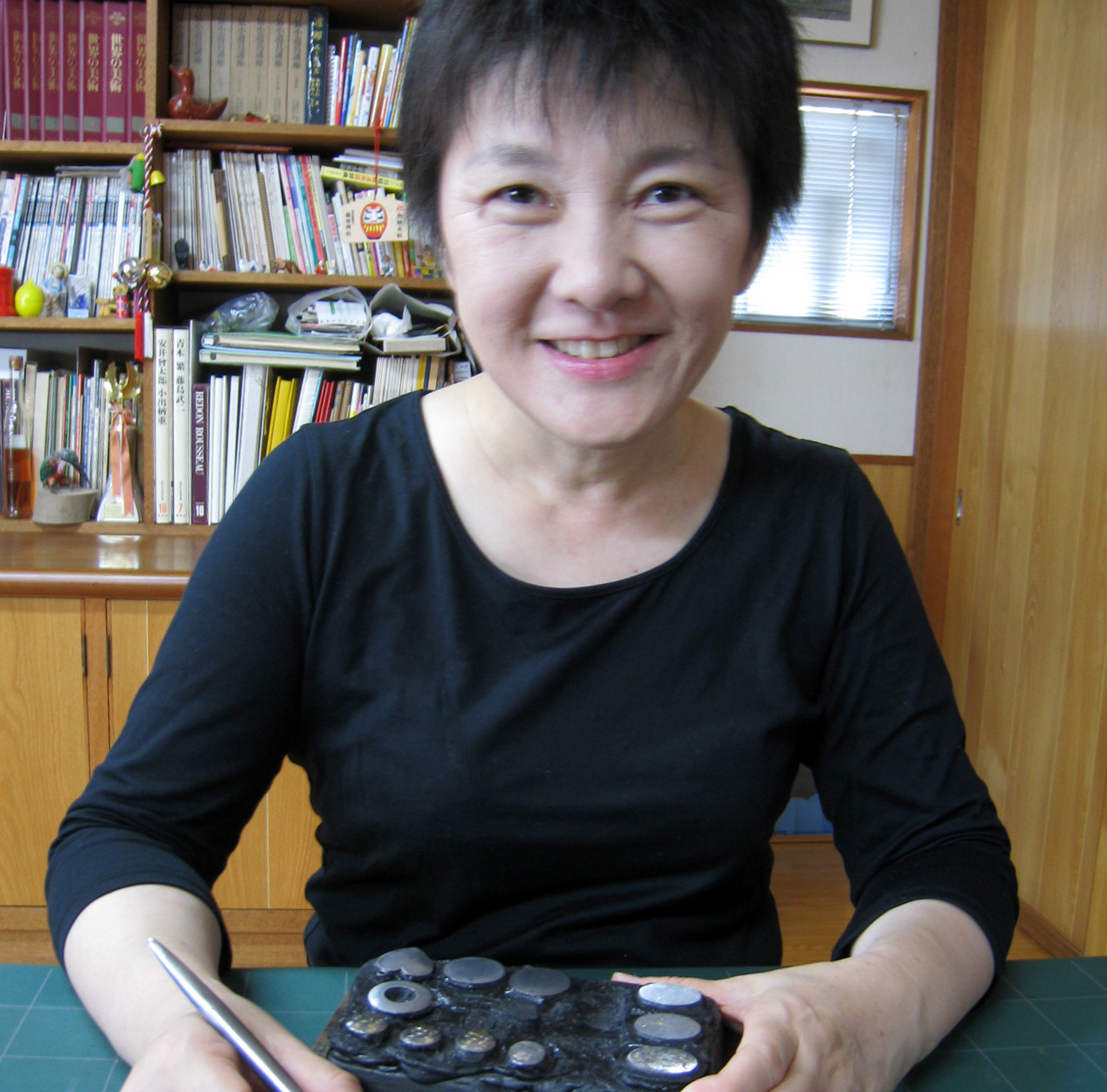 工芸家紹介のTOPに戻る ジャンル 肥ひ後ご象ぞうがん 雅号・地域 (熊本市) 氏名 きのしたようこ プロフィール 工芸品紹介 インタビュー 作品紹介 工芸家プロフィール 1958年 熊本市に生誕。 武蔵野美術大学卒業。 1980年 彫金やトンボ玉制作を開始。 2000年 後継者養成講座の第一期生として本格的に肥後象がんを始める。 公募展出品、個展などで活躍。 その他 伝統工芸士 ページTOPへ/HOME 肥(ひ)後(ご)象(ぞう)がんについて 肥(ひ)後(ご)象(ぞう)がんは熊本県(くまもとけん)に4つある国指定(くにしてい)の伝統的工芸品(でんとうてきこうげいひん)のひとつです。 肥(ひ)後(ご)象(ぞう)がんは鉄(てつ)に「金(きん)」や「銀(ぎん)」をはめこんで様々な模(も)様(よう)を表(ひょう)現(げん)します。「刀(かたな)のつば」や「火(ひ)縄(なわ)銃(じゅう)」の金(かな)具(ぐ)の装(そう)飾(しょく)がはじまりといわれています。 工芸品紹介ページ:肥(ひ)後(ご)象(ぞう)がん ページTOPへ/HOME 記事を選択するとインタビューが表示されます。 インタビュー(2010年頃) ▼ コミカルで愛嬌のある鬼や魚のモチーフ、優美な唐草のアレンジまで、きのしたようこさんの手にかかれば身につける人を楽しくさせる魅力的な絵柄やデザインの肥後象がんとなります。幼い頃から工作や絵画が得意で、美大では油絵を専攻。 以前から故郷・熊本の伝統工芸である肥後象がんに関心があったものの、当時は学べる場所もなく彫金の世界に飛び込んだのが始まりだったそうです。「ほかに美術関係の仕事もしていましたので彫金はほとんど独学でしたが、当時は、西部金工研究会で勉強する仲間に恵まれ、公募展などにも出品していました」 きのしたさんに転機が訪れたのは、2000年のこと。伝統工芸館で“後継者養成講座”の募集が始まると同時に、迷わず応募。第一期生として肥後象がん師への道を歩み始めました。 「肥後象がんは郷土を代表する伝統技法ですし、鉄地に金や銀を施すことで華やかにも渋くもなる。私は基本的に絵を描きたいので、たとえば縁起の良い物など身に付けると幸せな気持ちになってもらえる作品を作りたいですね」 ペンダントトップやブローチなどの装身具を主体に作っていますが、最近では香炉などの大きな物にも挑戦しています。そのために漆や木工の基礎も勉強してきたそうですが、全ては象がんを引き立てるため。 「せっかく手に入れた肥後象がんをしまい込んでしまうのはもったいない。使わないときは専用の額に飾ってもらえたらと思って」肥後象がんを全く知らない若者たちにも身につけてもらえるよう、自由な発想とデザインで肥後象がんの新しい境地を開こうと模索中です。 ページTOPへ/HOME 象がんブローチ_綿の花 きのしたようこ 綿の花の柄が象嵌されたブローチ。 肥後象がんタックピン_清正公烏帽子 きのしたようこ 熊本が誇る国指定伝統的工芸品「肥後象がん」の技法で、加藤清正公の烏帽子の柄を施したタックピン。 ページTOPへ/HOME 工芸家紹介のTOPに戻る