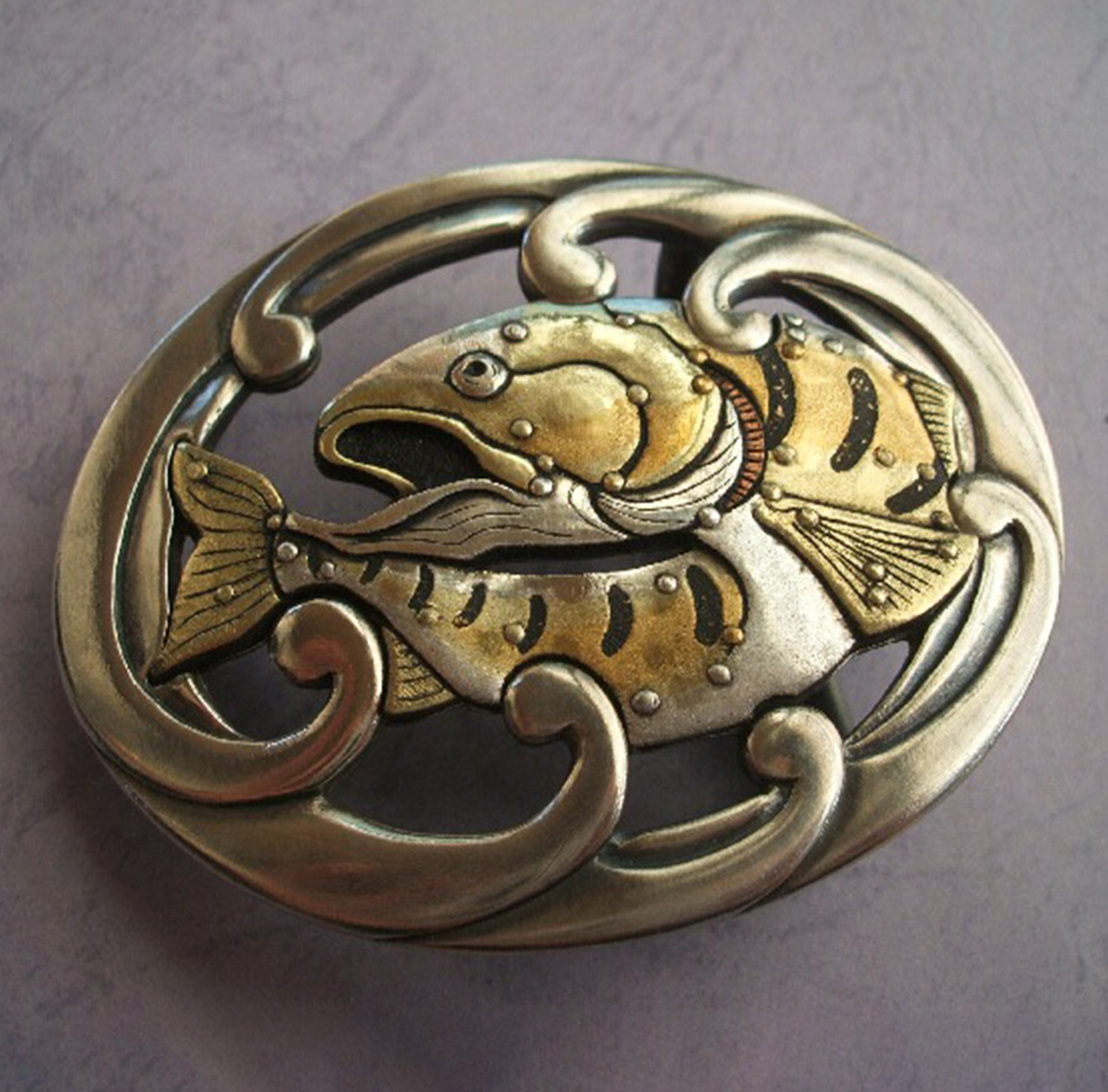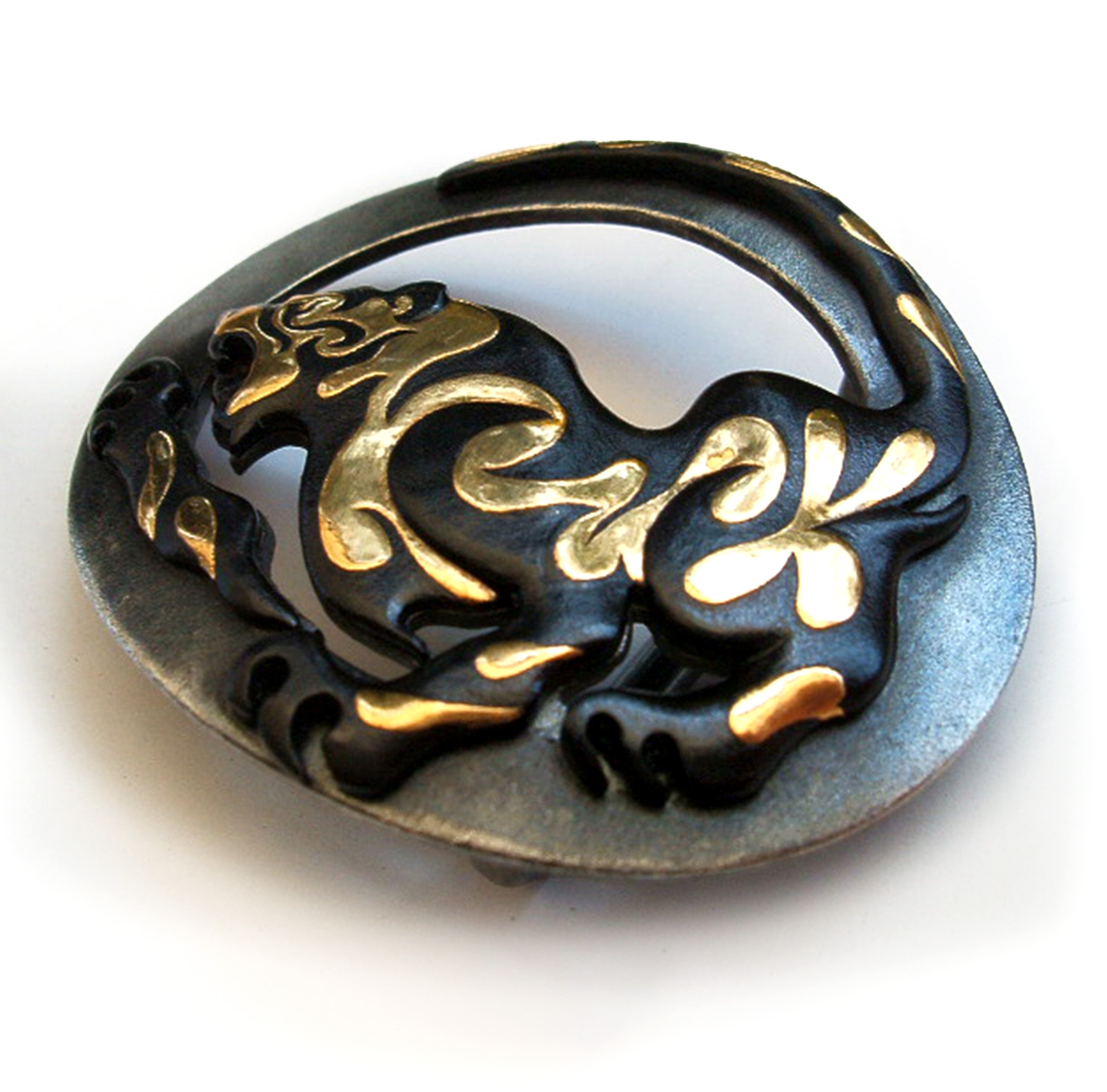 工芸家紹介のTOPに戻る ジャンル 肥ひ後ご象ぞうがん 雅号・地域 光秀(熊本市) 氏名 稲いな田だ憲けん太た郎ろう プロフィール 工芸品紹介 インタビュー 作品紹介 工芸家プロフィール 1976年 生誕。 高校卒業後、同市の米野美術店で修業。 河かわ口ぐち知とも明あき氏に師事。 2004年 独立。 2018年 西武伝統工芸展入選。 ページTOPへ/HOME 肥(ひ)後(ご)象(ぞう)がんについて 肥(ひ)後(ご)象(ぞう)がんは熊本県(くまもとけん)に4つある国指定(くにしてい)の伝統的工芸品(でんとうてきこうげいひん)のひとつです。 肥(ひ)後(ご)象(ぞう)がんは鉄(てつ)に「金(きん)」や「銀(ぎん)」をはめこんで様々な模(も)様(よう)を表(ひょう)現(げん)します。「刀(かたな)のつば」や「火(ひ)縄(なわ)銃(じゅう)」の金(かな)具(ぐ)の装(そう)飾(しょく)がはじまりといわれています。 工芸品紹介ページ:肥(ひ)後(ご)象(ぞう)がん ページTOPへ/HOME 記事を選択するとインタビューが表示されます。 インタビュー(2010年頃) ▼ 躍動感に満ち、今にも動き出しそうな龍や虎。優美な花鳥風月といった“静”をモチーフにしたものが多い肥後象がんの中で、肥後象がん師・稲田憲太郎さんが選ぶ題材は生き物を写し取った“動”の世界。もともとは武士たちが持つ刀の鐔(つば)などの装飾から派生した肥後象がんだけに、ベルトのバックルなどにカタチを変えた現代を生きる侍たちのステイタスといった印象です。 稲田さんは、叔父や生まれ育った家の貸主が肥後象がん師だったため小さい頃から自然に肥後象がんの魅力を身近で触れてきました。17歳で象がん師になることを決意し、高校を卒業すると米野美術店で肥後象がんの基礎を学びました。その後肥後象がん師・河口知明氏に弟子入り。 合計7年間の修行を終え、27歳で独立しました。現在も多くの象がん技術に触れながら、技術を高めることに力を注いでいます。 大きな鉄板から鉄地を切り出して成型して象がんを施していきますが、通常だと平面の鉄地の中に象がんを施すところを、稲田さんの場合は鉄生地をヤスリで削って輪郭そのものをデザインしていきます。「これに象がんを施すので多少手間はかかりますが、立体的に仕上がり躍動感が生まれます」。 また、渋い鉄地の決め手となる錆付けに使う液も、独自に調合したものを使います。この液を刷毛で付けながら焼いて目の細かい錆を出し、これを日本茶で煮ると、タンニンが付着して錆び止めの第一段階が終了。続いて食用油と油ゆ煙えんというススを調合したものを塗り、拭いて焼く作業を繰り返すと錆が止り、酸化皮膜を張った状態となります。 「錆び付け液は既製品もありますが、仕上がりが全然違います。象がん師によって材料も作り方も全く違いますね」ターゲットはとくに意識せず、若い男性たちにも使ってもらえるようなデザインを心がけているといいます。ただ、その複雑な作業工程ゆえに安価ではないため、特注のバックルなどは40代後半のおしゃれを知り尽くした男性たちに人気のようです。 「肥後鐔つばをデザイン画で描かれているグラフィックデザイナ?の方と組んでイベントをやろうという計画もあり、肥後象がんの枠の中だけでなく業種を超えて“本気”の人たちが集まって何かやりたいですね。例えば熊本城に展示させてもらったり、音楽と組み合わせたり。好きでやっているからといって、手に取ってもらわないと意味がないので、肥後象がんをどうやって若い世代にも浸透することができるかを日々考えています」。 肥後象がんの伝統技術と現代的感性をもって、令和の世に挑む。そんな若き志士の活躍に期待します。 ページTOPへ/HOME 狙う虎 稲いな田だ憲けん太た郎ろう 福岡で活躍中のデザイナー毛利清隆さんとコラボレートしたバックル。 バックル 稲いな田だ憲けん太た郎ろう 渓流の山女をイメージしたバックル(第43回西部工芸展入選作)。 ページTOPへ/HOME 工芸家紹介のTOPに戻る