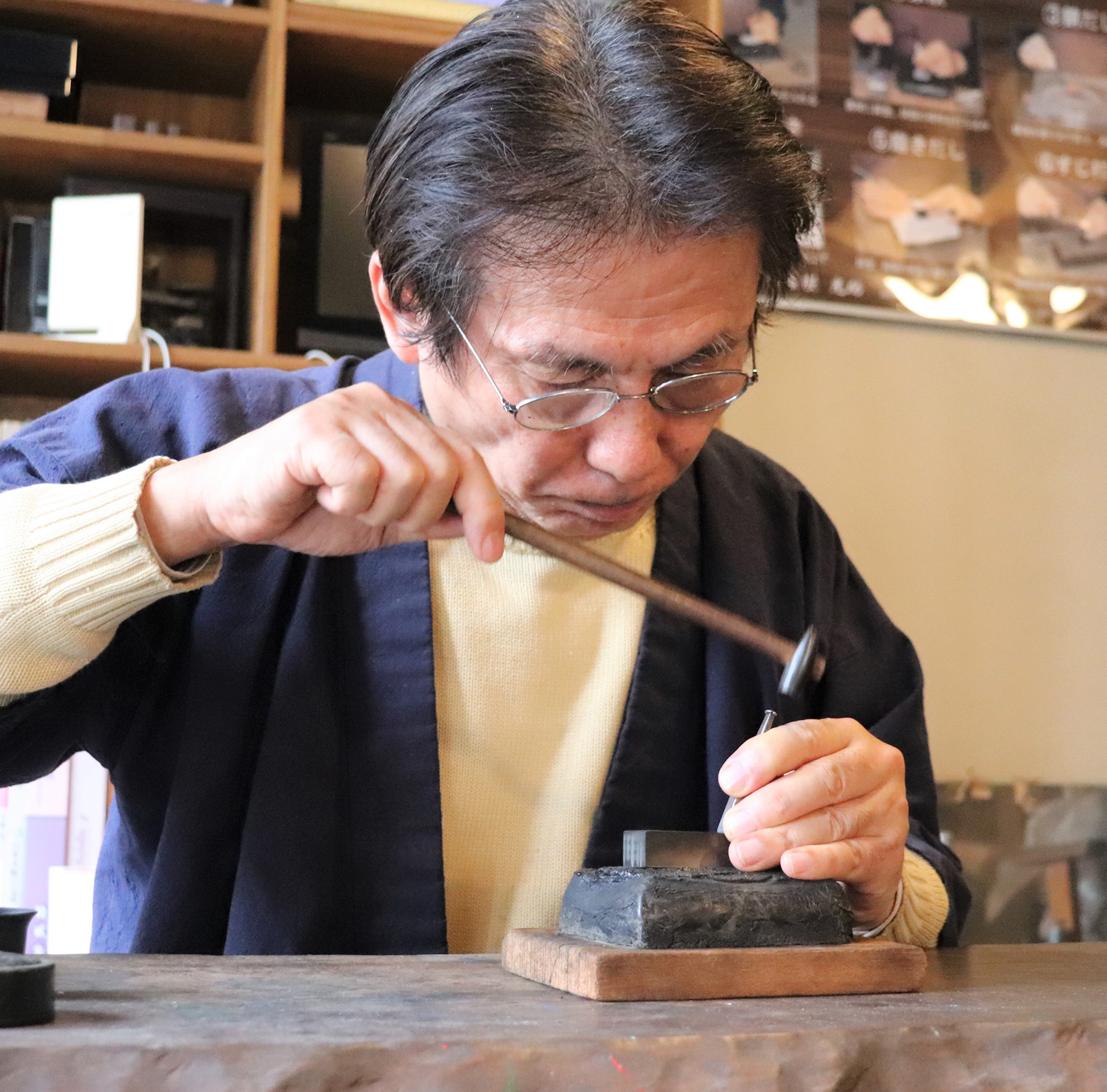 工芸家紹介のTOPに戻る ジャンル 肥ひ後ご象ぞうがん 雅号・地域 光助(熊本市) 会社名 株式会社光助 氏名 大おお住すみ裕ゆう司じ プロフィール 工芸品紹介 インタビュー 作品紹介 工芸家プロフィール 1957年 生誕。 1981年 会社を辞めて帰熊、この道に入り父・正敏さんから肥後象がんの技術を学ぶ。 1995年 代表取締役社長に就任。 伝統の技法を継承しつつ、付加価値のある作品づくりや異業種交流などで新分野の展開を図る。 肥後象がん振興会会長(2024年7月現在)。 ページTOPへ/HOME 肥(ひ)後(ご)象(ぞう)がんについて 肥(ひ)後(ご)象(ぞう)がんは熊本県(くまもとけん)に4つある国指定(くにしてい)の伝統的工芸品(でんとうてきこうげいひん)のひとつです。 肥(ひ)後(ご)象(ぞう)がんは鉄(てつ)に「金(きん)」や「銀(ぎん)」をはめこんで様々な模(も)様(よう)を表(ひょう)現(げん)します。「刀(かたな)のつば」や「火(ひ)縄(なわ)銃(じゅう)」の金(かな)具(ぐ)の装(そう)飾(しょく)がはじまりといわれています。 工芸品紹介ページ:肥(ひ)後(ご)象(ぞう)がん ページTOPへ/HOME 記事を選択するとインタビューが表示されます。 インタビュー(2010年頃) ▼ 江戸時代から鍛冶屋として熊本城に刀鐔を納めてきた大住家。廃刀令以降の1874年「肥後象嵌 光みつ助すけ」として創業しました。その伝統を受け継ぐのが4代目の大住裕司さんです。 「肥後鐔つばが全国的に名を馳せた江戸時代、坪井という町に象がん師が集められていたんです。大住家も京都から移り住み、廃刀令のあとに現在の屋号で店を始めたのが明治から。熊本は良い砂鉄に恵まれていたことも、象がん技術が栄えた理由の一つでしょうね」。 有名メーカーとタイアップした万年筆や腕時計など、異業種との商品開発も積極的に行っています。海外、とくに中国からの観光客に向けた新商品作りや象がんづくりの体験会など大忙しです。 先代たちの腕も確かで受賞歴は数えきれないほどありますが、あくまで商売人として使い手第一主義を貫いてきた大住家。 「作家肌と職人肌に分かれると思うのですが、大住家の場合は、一般の方に使って喜んでいただけるための商品づくりを目指す職人肌の家系ですね」。 大学を出た後、東京で会社員をしていた大住さんですが、スキー中に大ケガをして長期休養することに。「会社を辞めて、熊本で治療することになったんです。あの事故がなかったら会社員を続けていたかもしれません」。 山形県の大学教授と共に漆の技術を共同開発したり、ステンレスやチタンなど新しい素材と組み合わせた新商品開発のため、遠方にまで足を運んでいます。 「新商品の開発すべてを私が行っています。今はまだ不景気だから、他の業界の皆さんも何かを探している。逆に言えば不景気のときこそ新しいアイデアや商品を生み出すチャンスなんですよ。時代のニーズに合わせながら伝統を守り続けていきたいです」。 ページTOPへ/HOME 象がんブローチ 株式会社光助 ページTOPへ/HOME 工芸家紹介のTOPに戻る