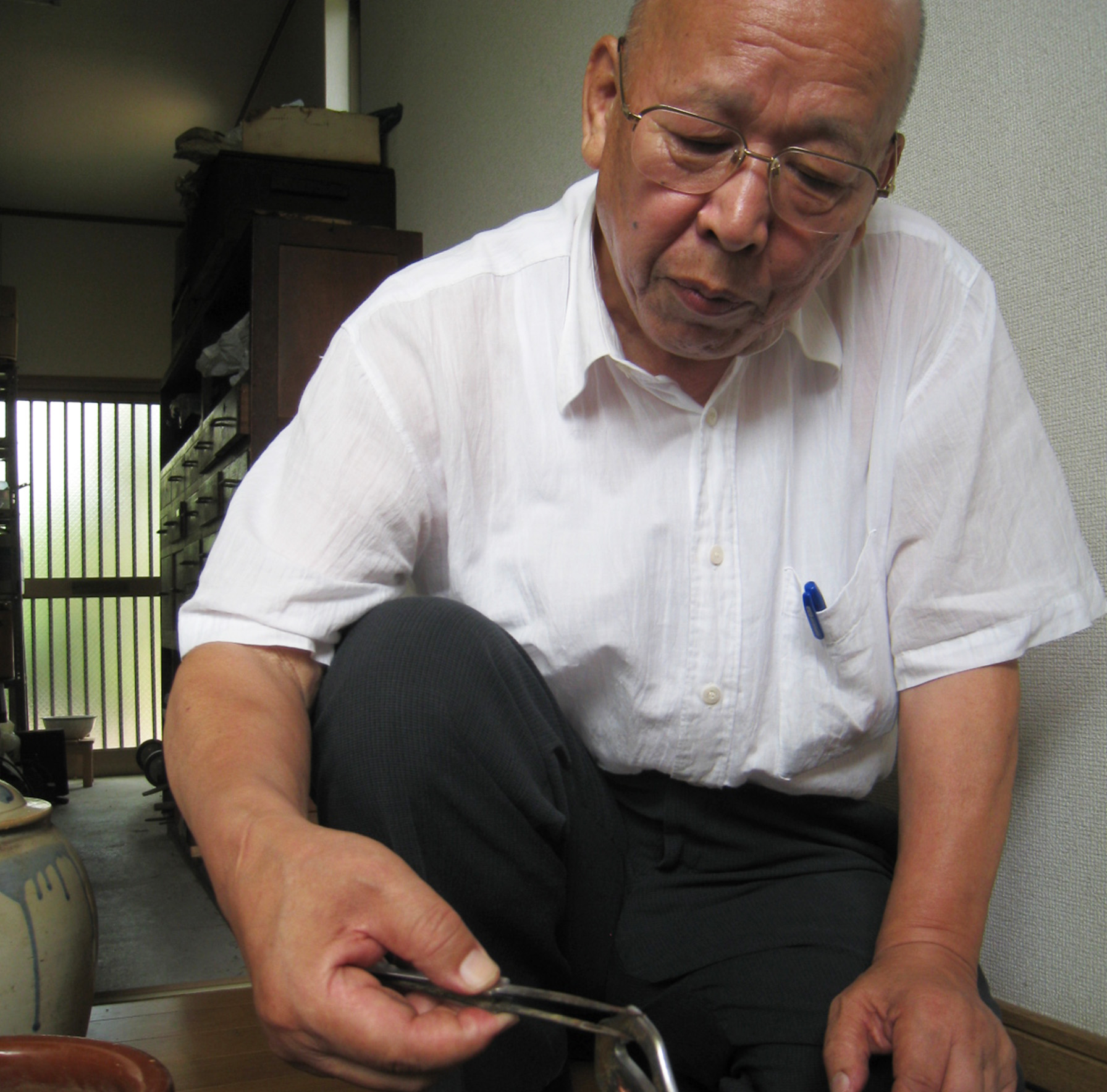 工芸家紹介のTOPに戻る ジャンル 肥ひ後ご象ぞうがん 雅号・地域 光城(熊本市) 会社名 米野美術店 氏名 米こめ野の純すみ夫お プロフィール 工芸品紹介 インタビュー 作品紹介 工芸家プロフィール 1938年 生誕。 父・健一氏が創業した「米野美術店」のもと、米よね光みつ太た平へい氏を中心とする6人の象がん師により肥後象がん制作を開始。ここから多くの象がん師が育つ。 自身も古来から続く錆び付けなどの技法を受け継ぐ。 ページTOPへ/HOME 肥(ひ)後(ご)象(ぞう)がんについて 肥(ひ)後(ご)象(ぞう)がんは熊本県(くまもとけん)に4つある国指定(くにしてい)の伝統的工芸品(でんとうてきこうげいひん)のひとつです。 肥(ひ)後(ご)象(ぞう)がんは鉄(てつ)に「金(きん)」や「銀(ぎん)」をはめこんで様々な模(も)様(よう)を表(ひょう)現(げん)します。「刀(かたな)のつば」や「火(ひ)縄(なわ)銃(じゅう)」の金(かな)具(ぐ)の装(そう)飾(しょく)がはじまりといわれています。 工芸品紹介ページ:肥(ひ)後(ご)象(ぞう)がん ページTOPへ/HOME 記事を選択するとインタビューが表示されます。 インタビュー(2010年頃) ▼ 肥後象がんといえば装身具が主流の今、米野純夫さんは肥後象がんの原点ともいえる刀鐔つばを主体に作る数少ない象がん師だ。 「刀の柄つかの頭かしら、馬ば針しん、縁ふち、小こ柄づかなども作りますが、どれも刀の添え物ですから単なる装飾品ではなく、実用に応じたものばかりなんですよ」18歳からこの道に入り、父が営む美術展で取引していた刀鐔つばを作っていた人間国宝・米光太平さんのもとで25年間働いた。しかし米光さんが高齢となり、次の担い手を育成することに。 「昔の徒弟制度のように無給で修行させるのは難しい時代でしたから、象がん師を米野美術店の社員として雇うことになったんです」こうして数多くの肥後象がん師たちがここから巣立っていった。 明治9年に発せられた廃刀令以降、装飾品へと移行していった歴史をもつ肥後象がん。 「そういう物は消耗品ですが、本当に良い作品は100年経っても大切にされて残るもの。後輩たちにはそうした作品を残してもらいたいですね」 そうした思いで取り組む米野さんもまた、刀鐔も1枚作るのに半年がかりだという。 「今は次々に商品化しないと商売が成り立たないところもあるので、時間をかけて良い作品を作ることが難しい時代になりました。良い仕事をするほど手間もかかって数が出来ない。高給取りにはなれないのが難しいところです」 「若手工芸家の皆さんには良い作品をたくさん見てほしい。見る目が腕を引っ張るんです。買い手の皆さんには作品の良し悪しを見比べて、良い作品を手に入れていただきたいですね」 ページTOPへ/HOME 鐔 米こめ野の純夫 金銀の丸い模様を一つひとつ打ち込んだ刀鐔。よく目を凝らすと細川家の九曜紋がデザインされている ページTOPへ/HOME 工芸家紹介のTOPに戻る